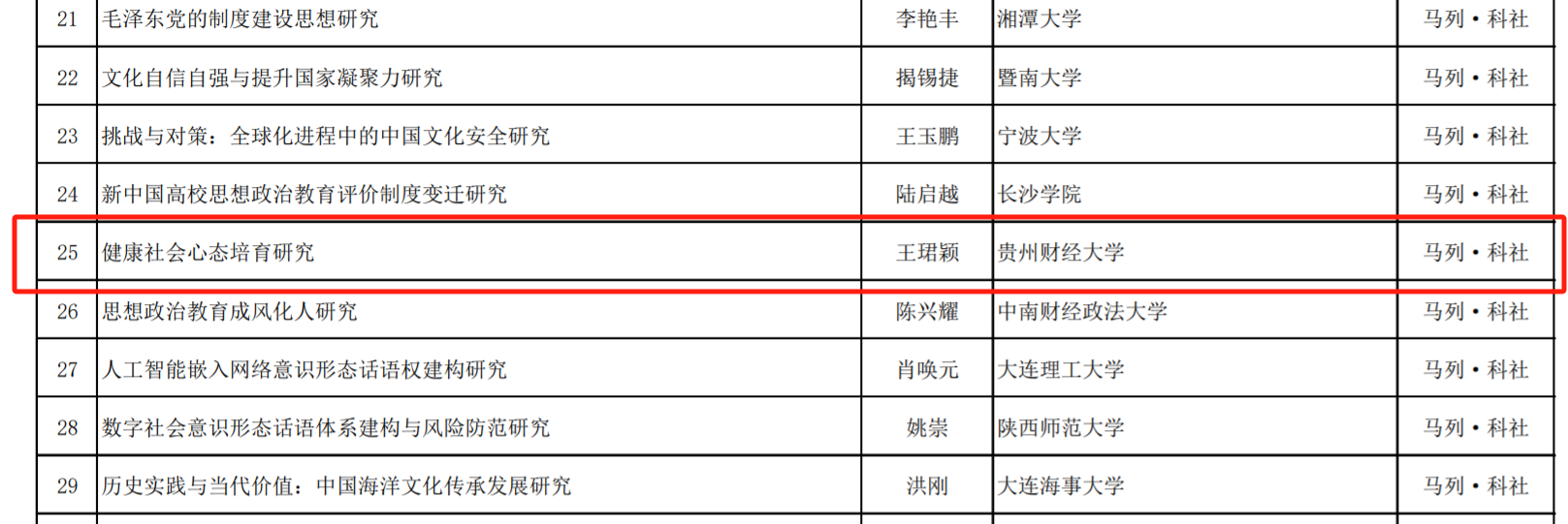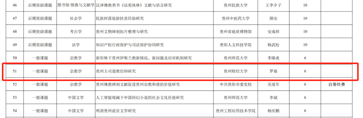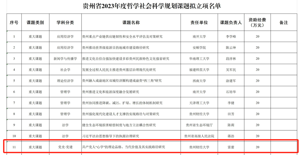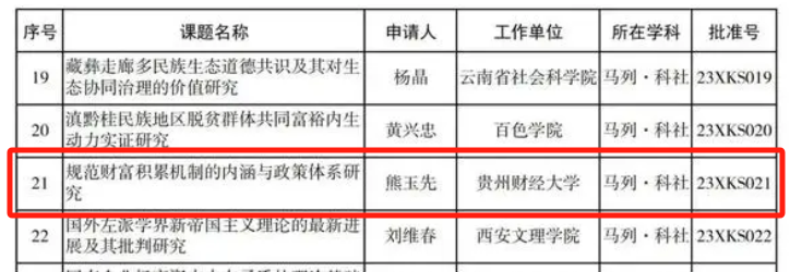 其中,熊玉先老师的《规范财富积累机制的内涵与政策体系研究》获得2023年度国家社科基金西部项目立项资助,王珺颖老师的《健康社会心态培育研究》获得2023年度国家社科基金后期资助项目立项资助,雷蕾老师的《共产党人“心学”的理论品格、当代价值及其实践路径研究》获得贵州省2023年度哲学社会科学规划课题重大课题立项,罗禧老师的《贵州土司道教信仰研究》和《深化拓展黔台两地少数民族交流合作研究》分别获得2023年度哲学社会科学规划课题一般课题和省委重大问题调研课题立项资助。